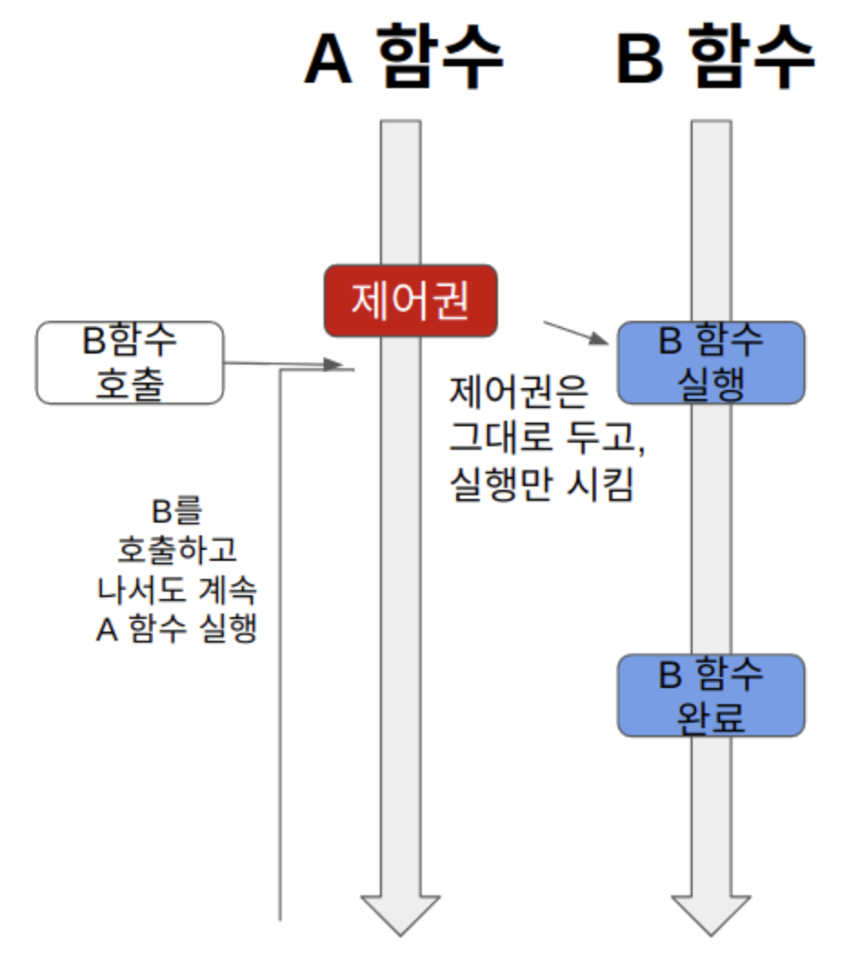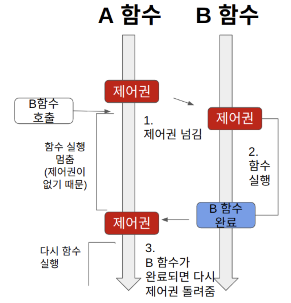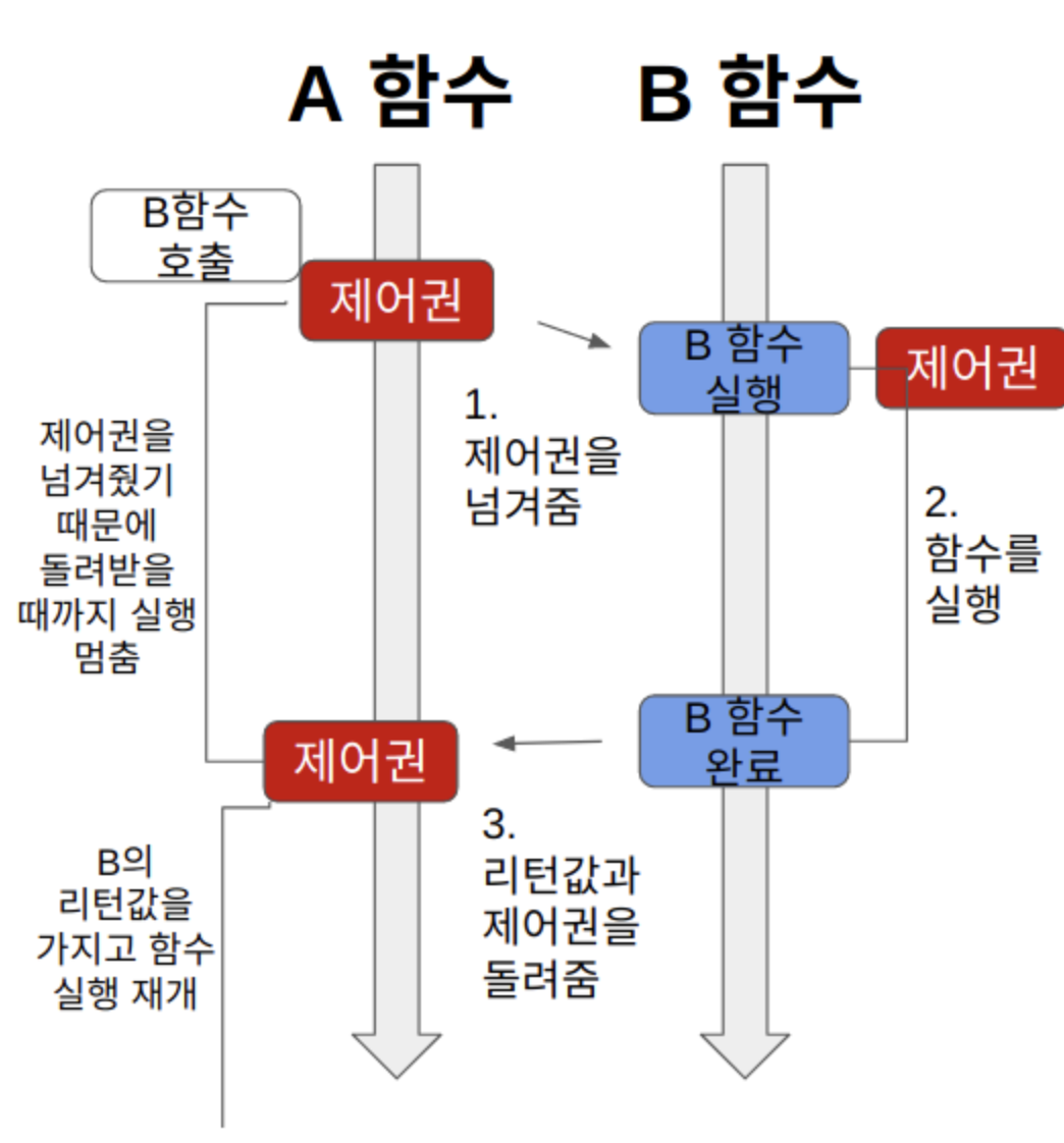 A 함수는 제어권을 B함수에 넘겨주어 B 함수가 결과를 돌려줄 때까지 멈춘다.