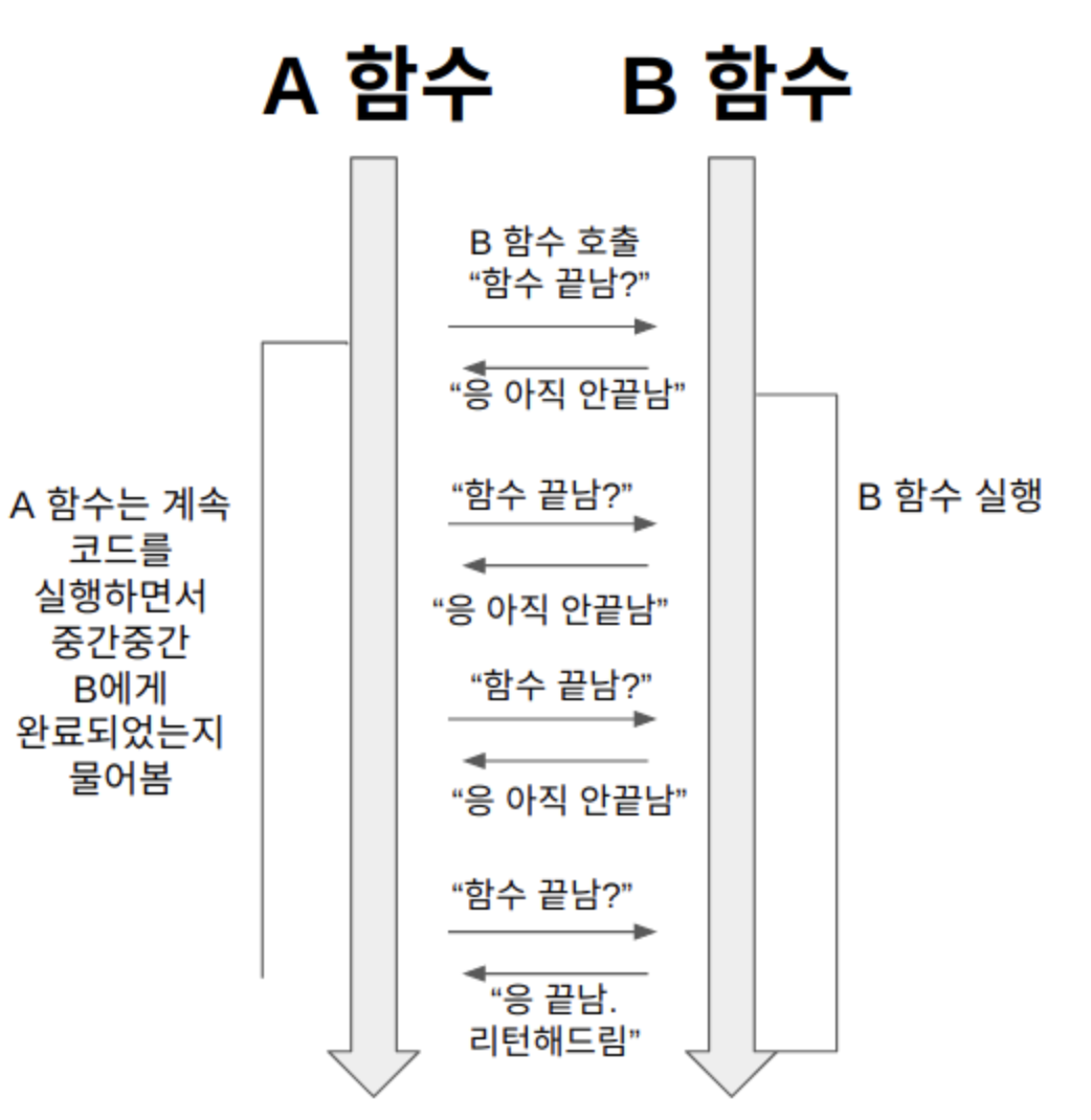 Non-Blocking이라서 제어권이 넘어가지 않은 A 함수는 요청한 B 함수가 끝날 때까지 결과를 확인하면서 기다리고 결과를 리턴 받으면 Synchronous라서 순서대로 바로 실행한다.