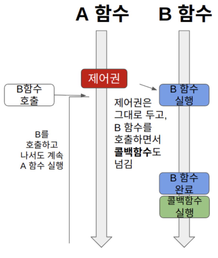 A 함수가 B 함수 호출 후에도 제어권을 가지고 있으므로 다음 코드를 진행한다. B는 진행하다 함수가 완료되면 넘겨받은 콜백함수를 실행하여 완료 로직을 실행한다.