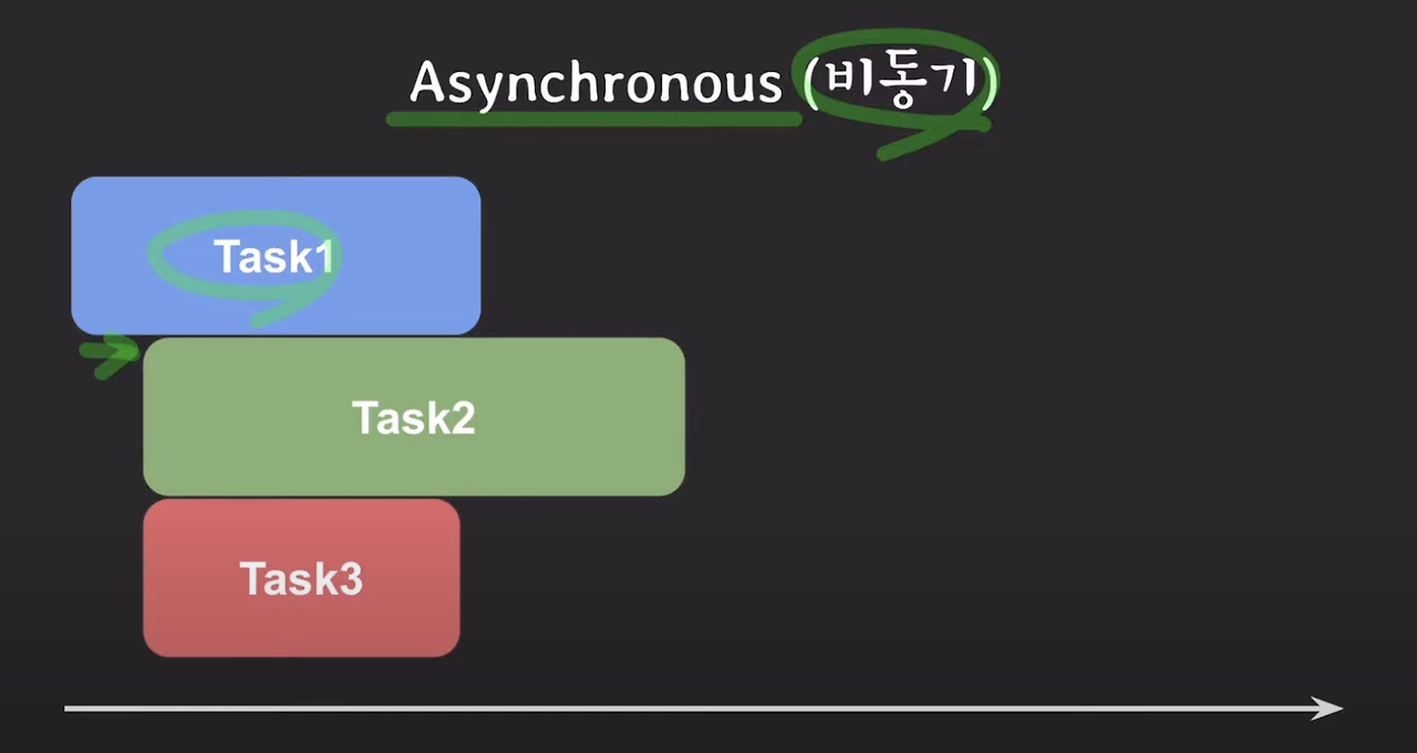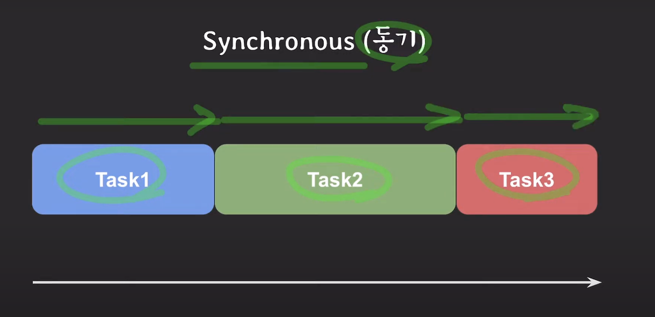 Task 2가 실행되기 위해서는 Task 1의 종료시점을 알아야하고, Task 3가 실행되기 위해서는 Task 2의 종료 시점을 알아야 하기에 Synchronous는 호출한 함수의 결과에 관심이 있고 결과를 받으면 바로 처리한다.