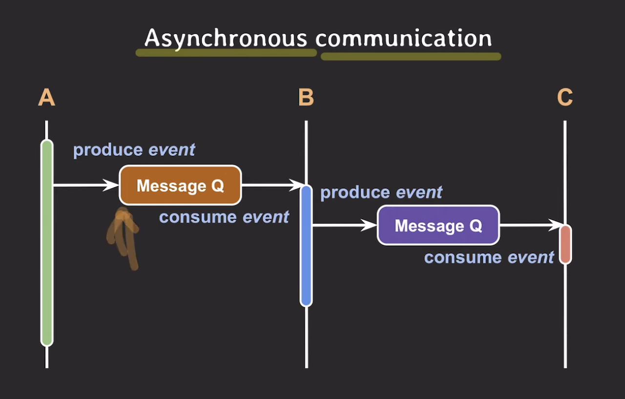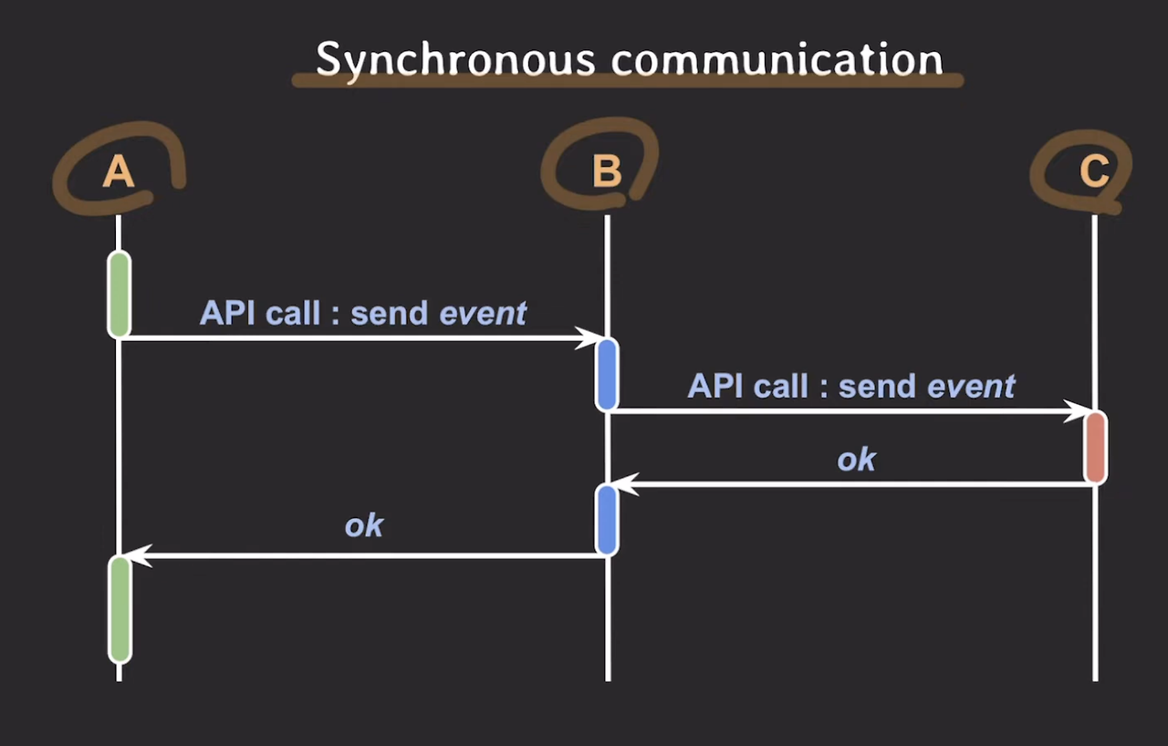A 에서 B를 호출하지만 A는 계속해서 진행되고 있고 B 에서 C를 호출하지만 C의 결과를 받지 않고도 계속 진행된다